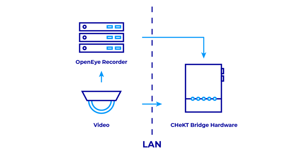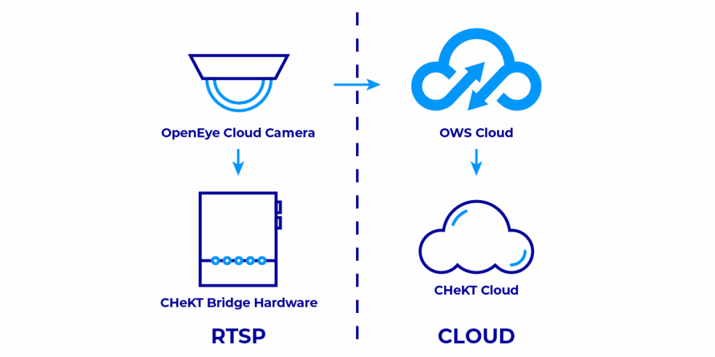 Monitoring Integration CHeKT Combine CHeKT with OpenEye Web Services to experience a streamlined and intelligent video monitoring solution. Book a Demo Local Connection Local connection to OpenEye cloud-managed recorders. Video Verification Verify events with live video from your OWS system. Video in Partner Platform View OpenEye video on the CHeKT platform. Transmit Macro Events Send macro-based events from OpenEye recorders to the CHeKT video verification bridge hardware. Ecosystem CHeKT Integration For Improved Video Monitoring The OpenEye and CHeKT integration delivers an integrated security platform, combining the power of intelligent video security and central monitoring stations for enhanced event verification, faster response times, and real-time remote video monitoring. Macro-Based Events OpenEye recorders dispatch macro-based events to the CHeKT visual verification bridge hardware, which can then be referenced for live monitoring in the CHeKT visual security interface for video verification of the event. Direct connection between OpenEye recorders and the CHeKT video verification bridge hardware. Transmission of specified events from OpenEye recorders to the CHeKT video verification bridge hardware. Note: This integration is only available with certain licensing tiers. See OWS Licensing for more information. Additionally, this integration is not compatible with OpenEye cloud cameras and requires a recorder or NVR for functionality. Analytics-Enabled Cameras The CHeKT visual verification bridge hardware can connect to OpenEye analytics-enabled cameras on the same local area network using ONVIF to access live video and events for use in live monitoring and video verification. Transmission of live video from OpenEye analytics-enabled cameras to the CHeKT video bridge hardware, over the local area network. Transmission of analytics-based events from OpenEye cameras to the CHeKT video bridge hardware, over the local area network. OpenEye Cloud Cameras The CHeKT visual verification bridge hardware can connect to OpenEye Cloud Cameras to access live video and events for use in live monitoring and video verification. Transmission of live video from OpenEye Cloud Cameras to the CHeKT video bridge hardware using RTSP. Transmission of analytics-based events from OpenEye Cloud Cameras to the CHeKT video bridge hardware using a cloud-to-cloud connection. Integration Improvements Soon, you can use OpenEye recorders and cloud cameras with CHeKT’s video monitoring solution through a bridgeless solution; arm your location through OWS, with CHeKT supporting the central station workflows and agent experience. Today, you can order CHeKT bridge hardware directly from OpenEye. Integration Resources Learn More About CHeKT Interested in learning more about how you can incorporate the CHeKT solution with OWS? Check out the additional resources below. CHeKT Website Visit CHeKT’s website to learn more about their monitoring solutions. Learn More Knowledge Base Visit OpenEye’s Knowledge Base for instructions on how to integrate CHeKT into your video security. Learn More OWS Licensing This integration is only available with certain licensing tiers. Check out the OWS Licensing page for more information. Learn More Integrated Security Solutions Strengthen Security With Intelligent Video Monitoring OpenEye Web Services delivers a complete end-to-end solution while providing the freedom of choice to integrate with industry-leading monitoring solutions for more seamless security that aligns with your business needs—today and tomorrow. Verify in Real Time With video verification built in, events from OpenEye recorders and analytics-enabled cameras are transmitted directly to the central station through CHeKT. Operators can assess each event as it happens, providing businesses with faster response times and a more reliable monitoring service. Learn More Minimize False Positives Reduce costly false positives by enabling monitoring stations to visually verify events through OpenEye video, ensuring that only legitimate threats are escalated. Learn More Proactive Security Response With event video, monitoring centers can proactively address suspicious activity as it unfolds. Operators are equipped to act quickly, engaging on-site personnel or law enforcement to help prevent escalation. Learn More Simplify Monitoring Workflows By linking video directly with events in a single interface, OpenEye and CHeKT reduce manual steps for central station operators. This streamlined workflow improves operator accuracy, shortens response times, and allows monitoring companies to deliver higher-value services to their customers. Learn More Additional Integrations Monitoring Integrations Make all your security solutions work in OpenEye Web Services through our powerful open ecosystem, featuring a range of different providers. Bold View OpenEye events, alerts, and video natively in a powerful monitoring platform designed to enhance security. View Integration Immix Integrate your monitoring solution with OpenEye video to leverage powerful events and alerts from OWS. View Integration Topo.ai View OpenEye events, alerts, and video natively in a powerful monitoring platform designed to enhance security. View Integration See All Integrations Featured Resources Blog Reduce Human Involvement With Intelligent Video Monitoring Find out how intelligent video monitoring tools provide a cost-effective way to improve security and operations. 9 min read Video Strengthen Security Operations With OpenEye’s Intelligent Video Monitoring Tools Reduce false alarms, minimize incidents, and streamline security with OpenEye's intelligent video monitoring tools. 2 min read On-Demand Webinar Proactive Video Monitoring Tools for Perimeter Security and Incident Prevention Discover how false alarms can drain resources and compromise perimeter safety — and how OpenEye’s intelligent video monitoring tools help reduce false positives while alerting o